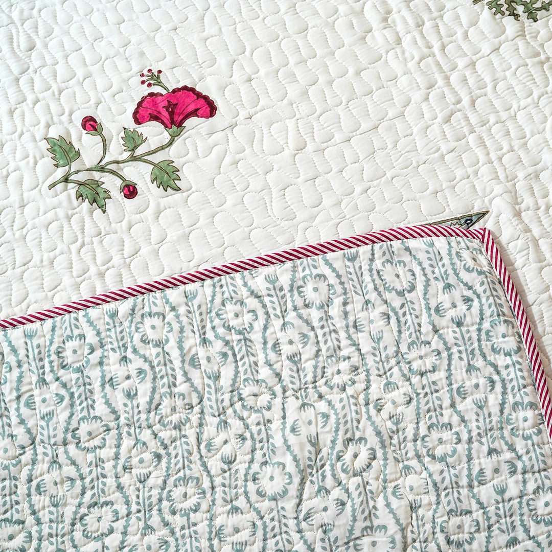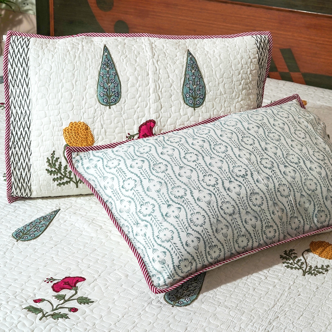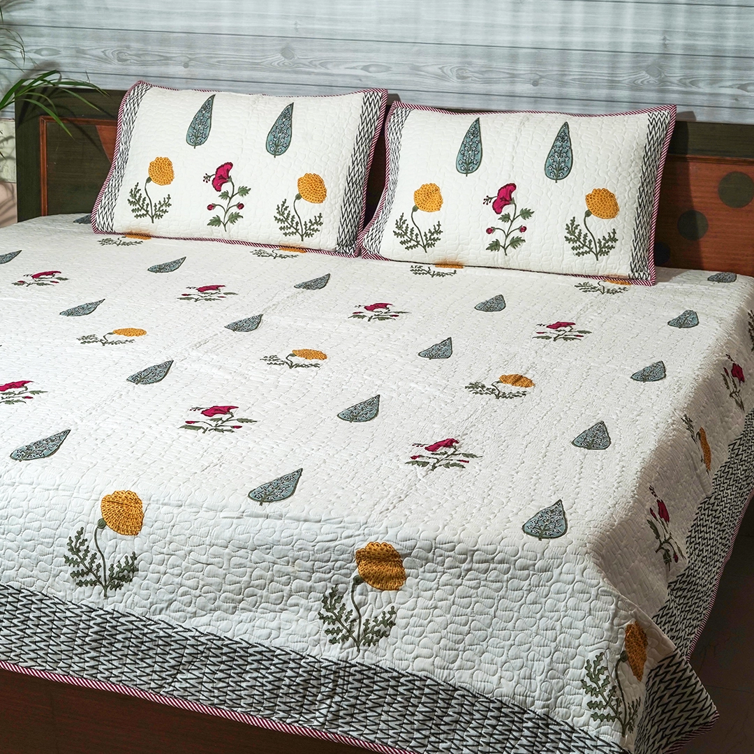 Indulge in luxurious comfort and timeless style with our Marigold & Paisley Quilted Bedspread Set. Designed for elegance and versatility, this set features a supersoft, skin-friendly 100% cotton construction with a beautiful hand-block print. Its reversible design and subtle floral patterns create an aesthetic of grandeur, while the included two full-sized pillowcases complete the look. Washed and treated for an exceptionally opulent feel, this set guarantees high comfort, durability, and the convenience of machine washability.
