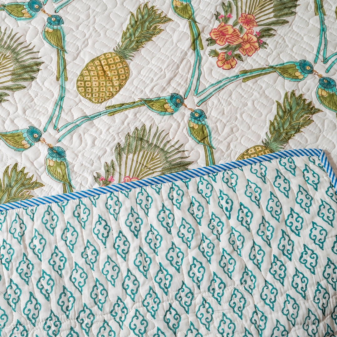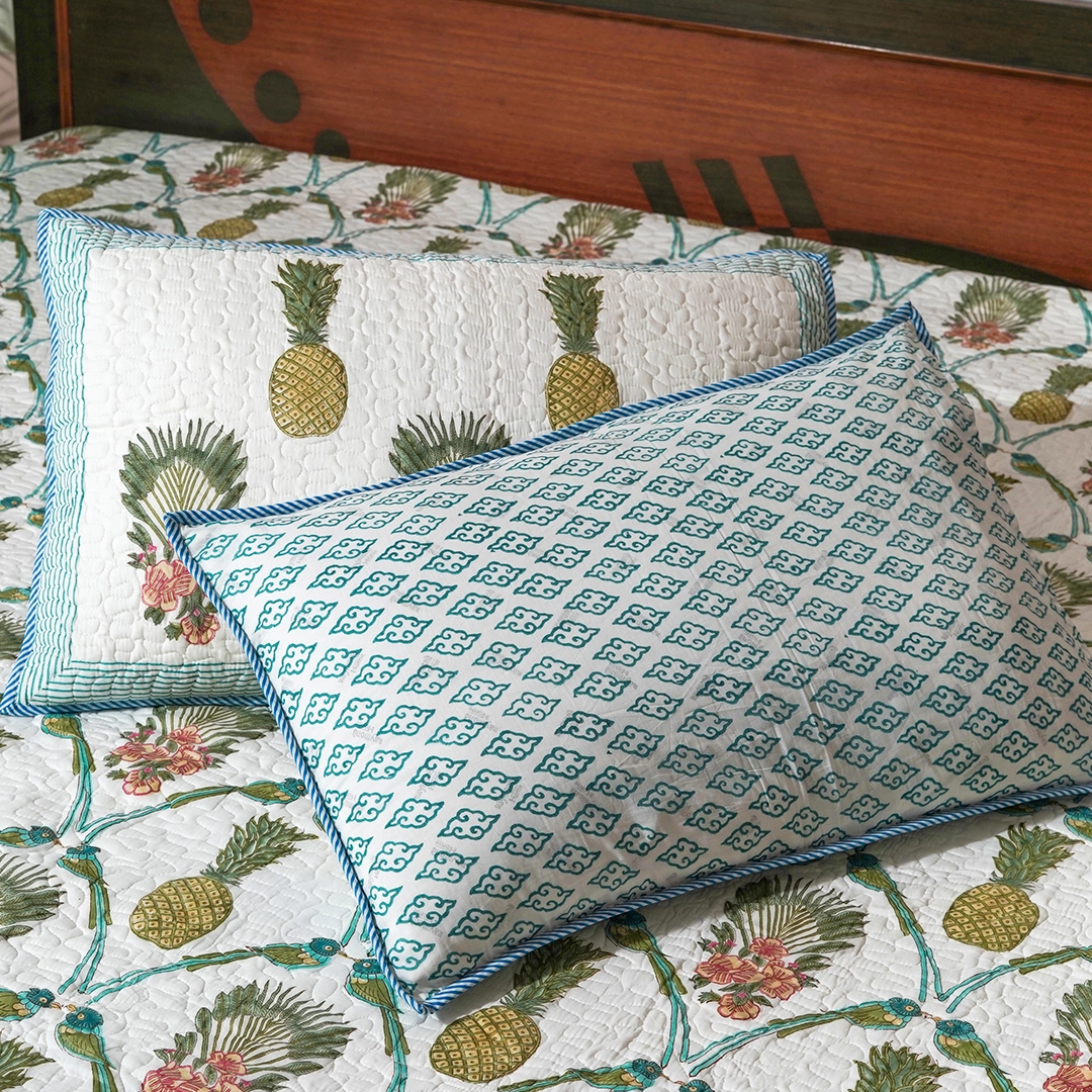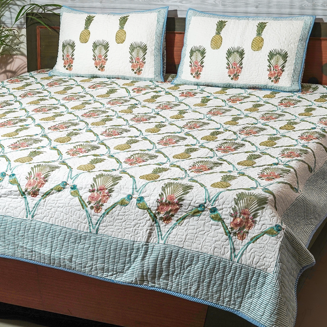 Transform your bedroom into a luxurious sanctuary with the Annanas Vatika Quilted Bedspread Set. Experience superior comfort with its supersoft, skin-friendly 100% cotton fabric. This set features an elegant, reversible hand-block print of florals and pineapples, making it a truly aesthetic and versatile addition. Complete with two full-sized pillowcases, it offers decorative grandeur without compromising on practicality. Washed and pre-treated for ultimate opulence and durability, it's also incredibly easy to maintain, being fully machine washable.