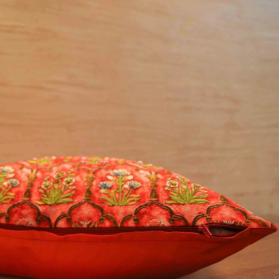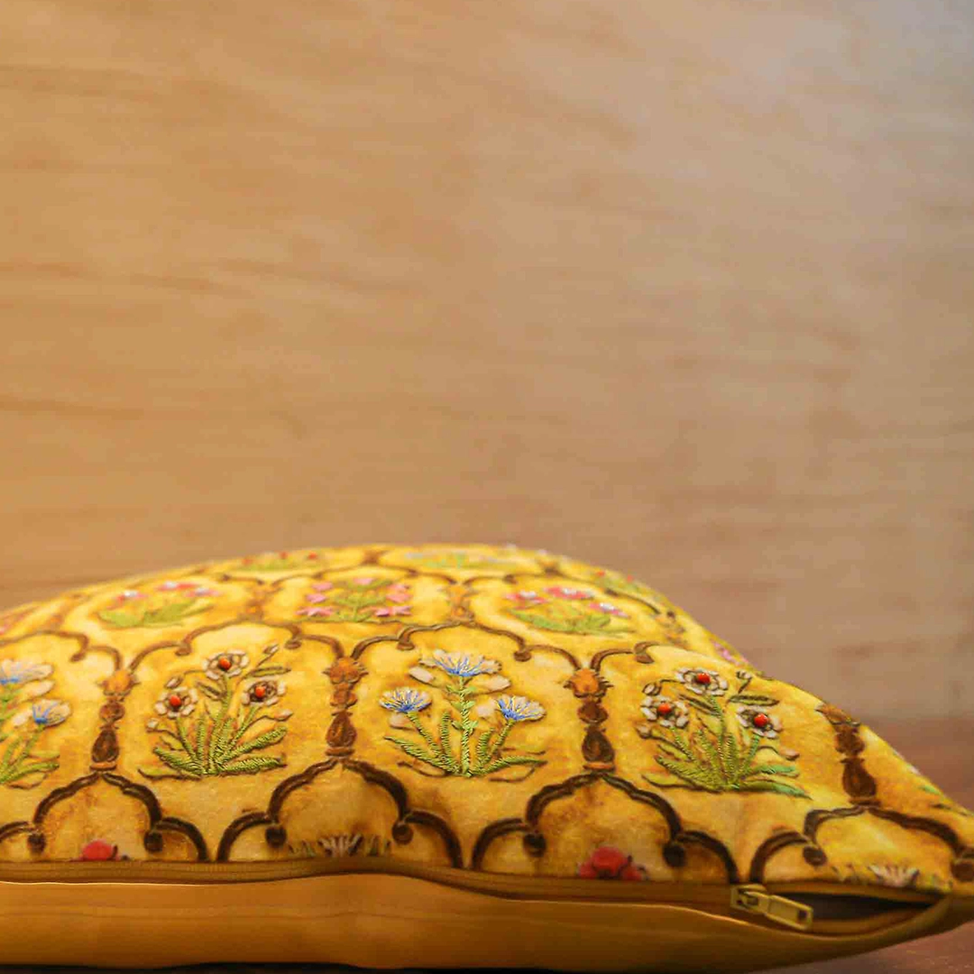 A digital print base cushion cover reflecting mughal art work. The leaves and flowers have been highlighted with embroidery and pearl work.Its a set of 2 cushion covers. WE CAN CUSTOMIZE THIS DESIGN IN ANY SIZE. FOR CUSTOMIZATION PLEASE MESSAGE US ON WHATSAPP