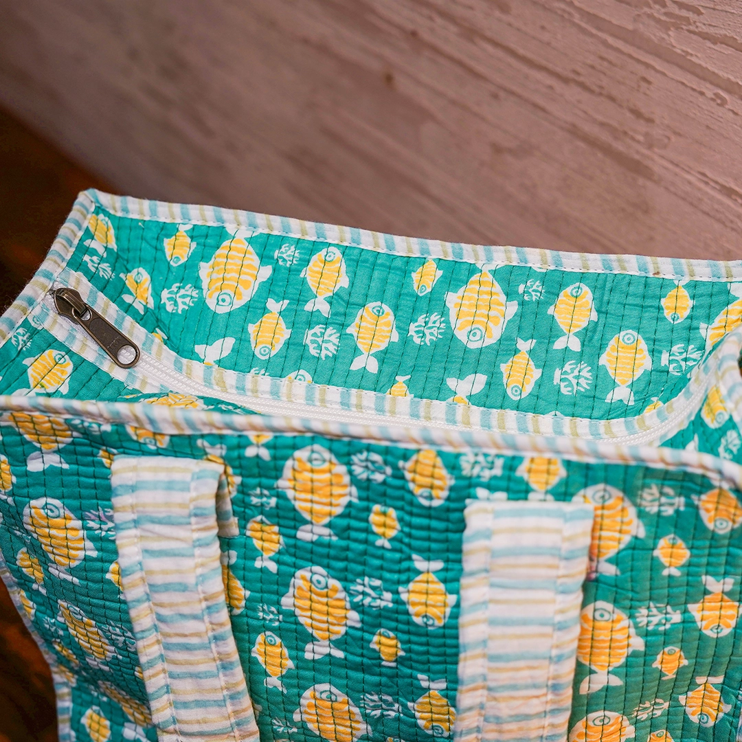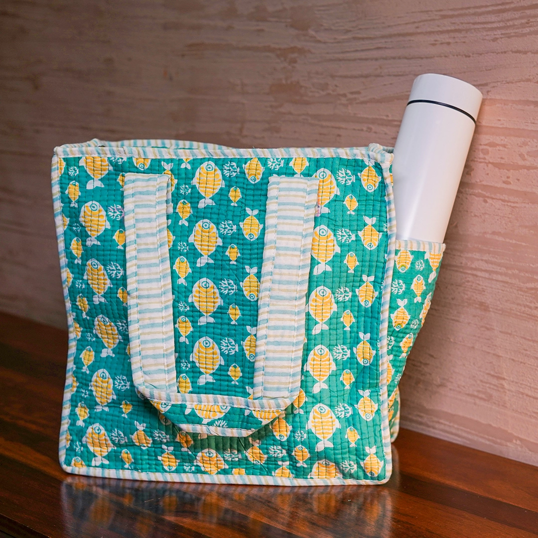 Our Mini Tote Bag is the ultimate accessory for kids on the go! This compact and practical bag, measuring 12" H x 12" W, is perfect for daily errands, shopping, school lunch bags or as a must-have for weekend trips. It features strong shoulder straps, inside waterproof lining and a secure zip closure for peace of mind. Crafted with care from 100% cotton, this reusable and washable tote is printed on both sides and includes an external pocket for a water bottle. Embrace sustainability with this plastic-free alternative, expertly handcrafted in India.