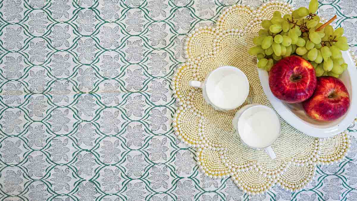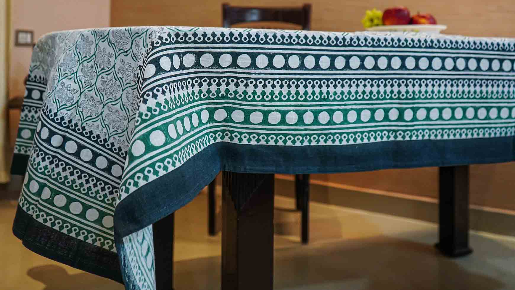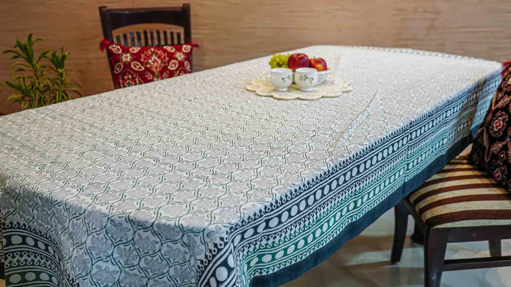 Authentic Hand Block Printing: Each piece is lovingly hand-stamped by skilled artisans using traditional wooden blocks, creating a unique and intricate floral pattern that tells a story of heritage and craftsmanship. Distinctive Border Design.The tablecloth is framed by a striking, detailed border in a sophisticated midnight green and white print, beautifully contrasting the subtle, all-over floral motif. Premium Textured Cotton: Made from durable yet soft cotton, the fabric has a beautiful texture that adds a rich, tactile feel to your dining setting. It's breathable, easy to care for, and designed for long-lasting use. Generous Size: Measuring 60" x 90" (152cm x 228cm), this table cover is perfectly sized for most standard 6 seater dining tables, providing an elegant and full drape.