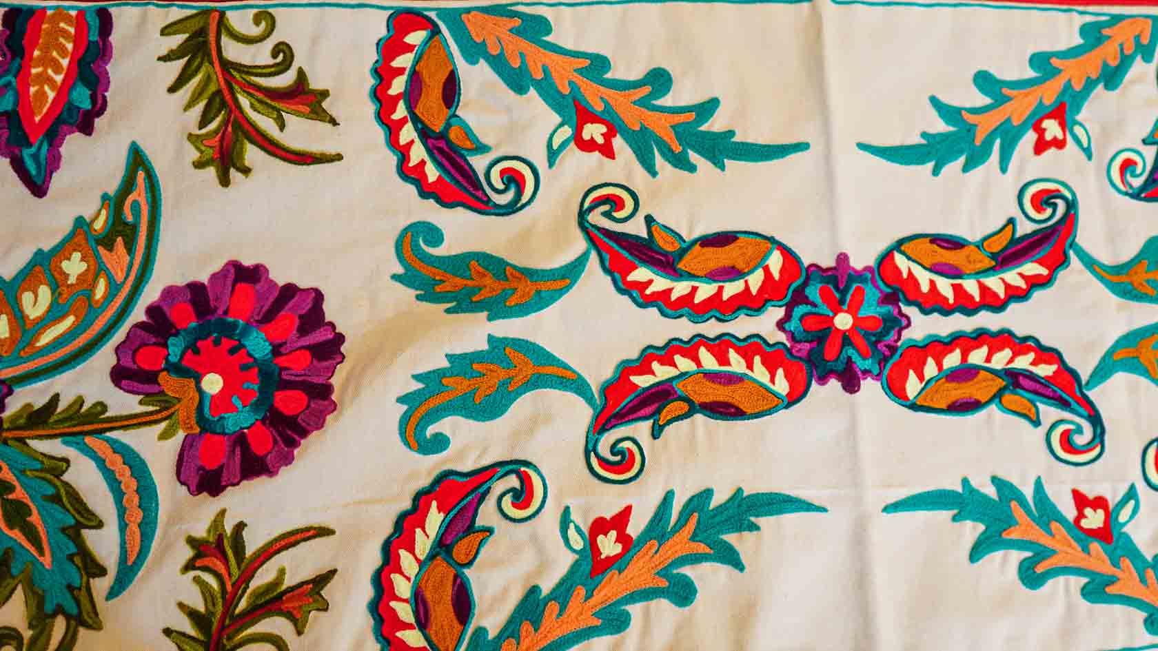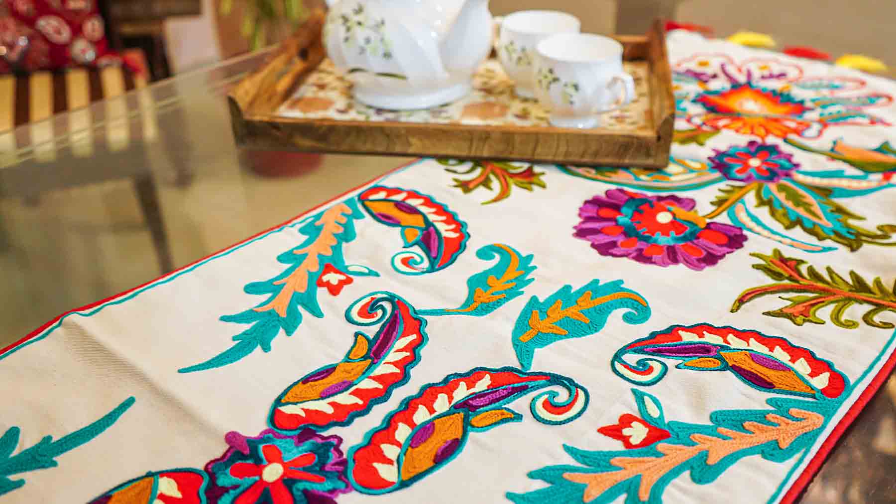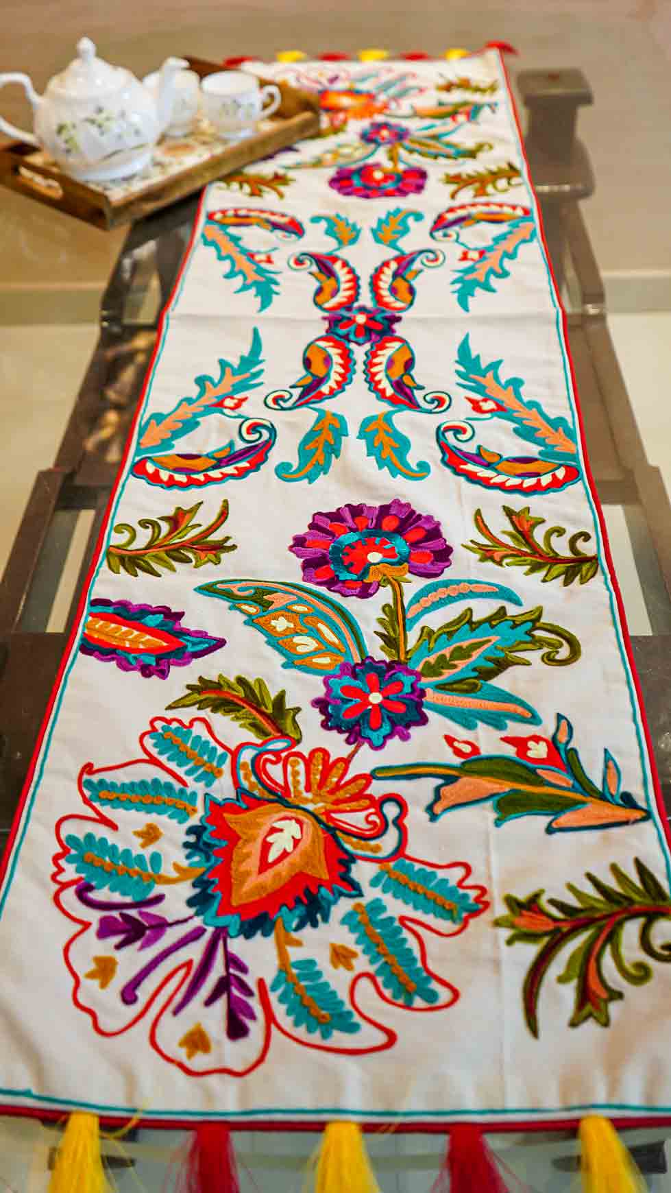 This beautiful table runner features intricate floral and paisley embroidery in a vibrant, Suzani-inspired design. Meticulously stitched in a rich palette of red, turquoise, orange, and purple on an off-white cotton base, it's finished with playful tassels on each end. A true statement piece, it adds a touch of bohemian elegance and artisanal charm to any table. The size is 150 cm * 40 cm
