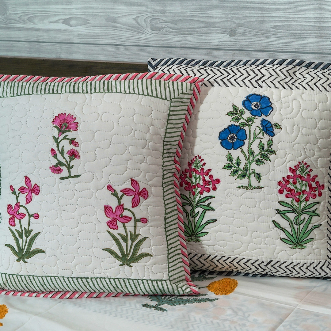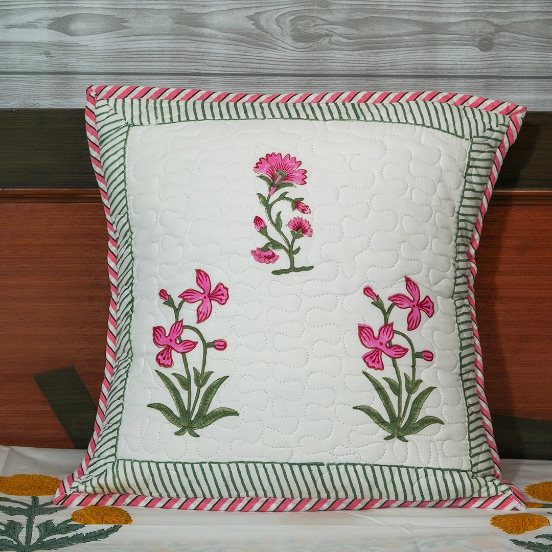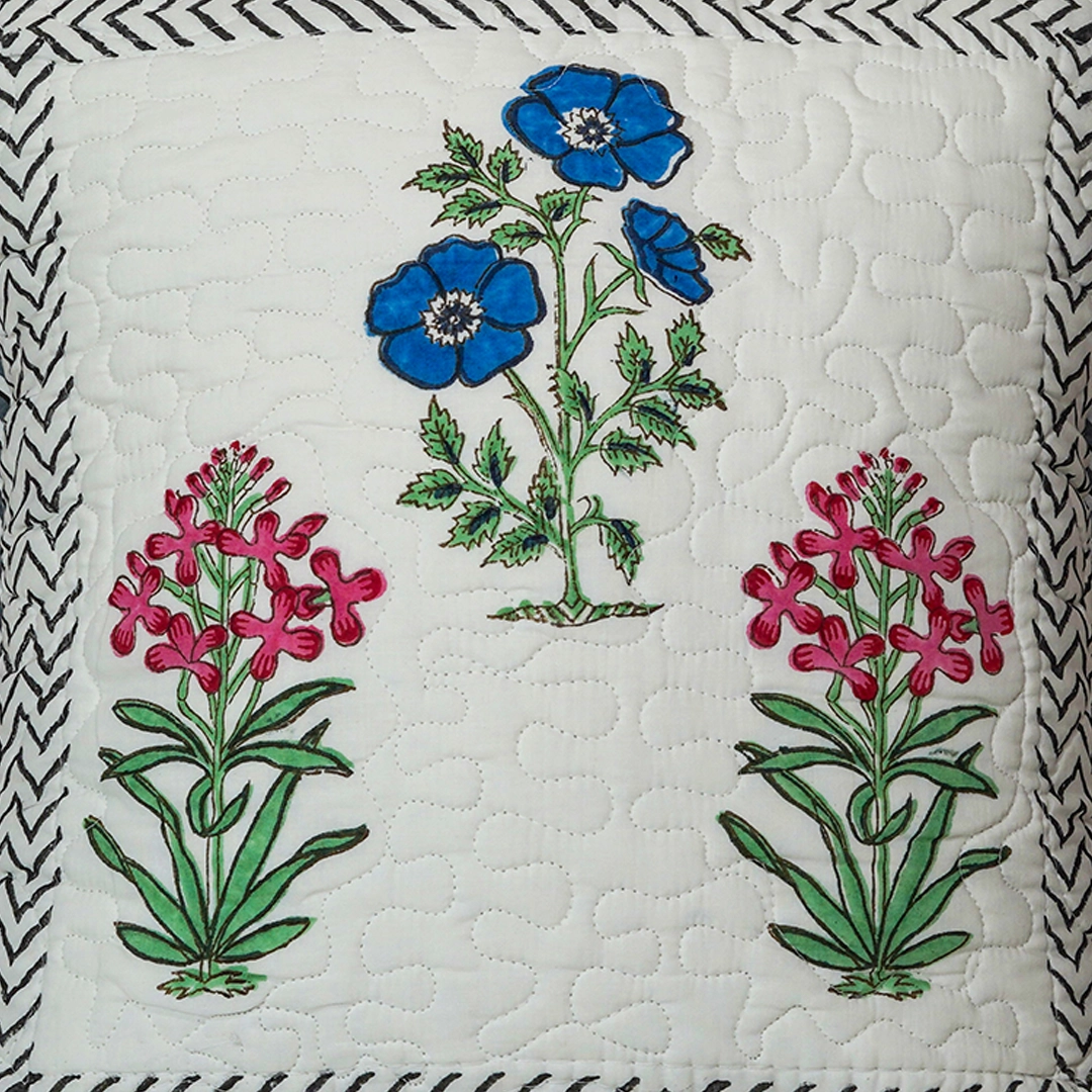 This set of hand-block printed cushion covers, each 16" x 16", brings a touch of classic charm to any space. The covers feature a soft, quilted texture and a crisp white background. One cover showcases delicate hand-block printed motifs of vibrant pink and deep crimson flowers with green stems, while the other displays striking cobalt blue and pink flowers. Both are framed by borders with complementary patterns, one in a striped green and pink and the other in a bold black and white chevron. These covers are an ideal choice for adding a refined, handcrafted aesthetic to your sofa or bed.