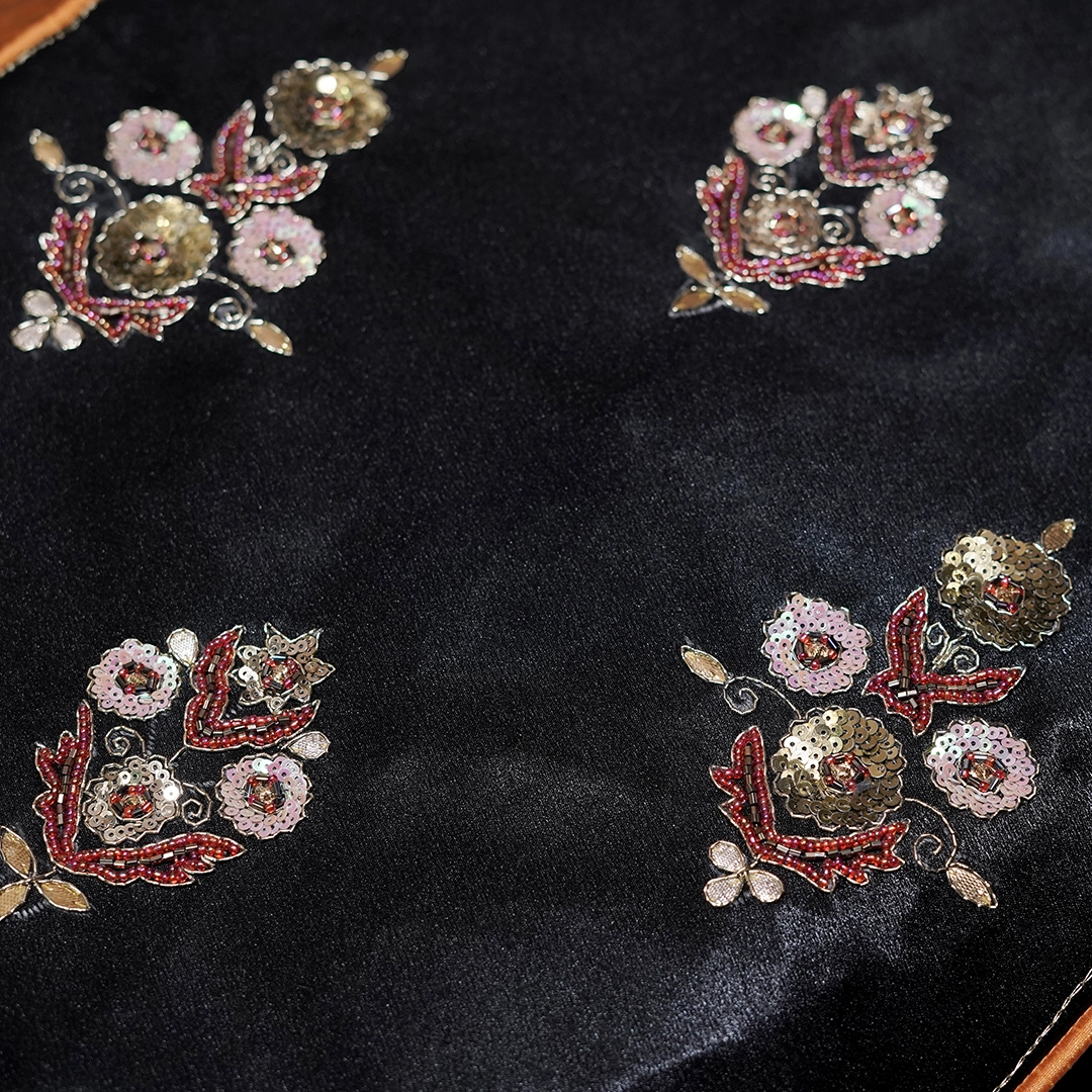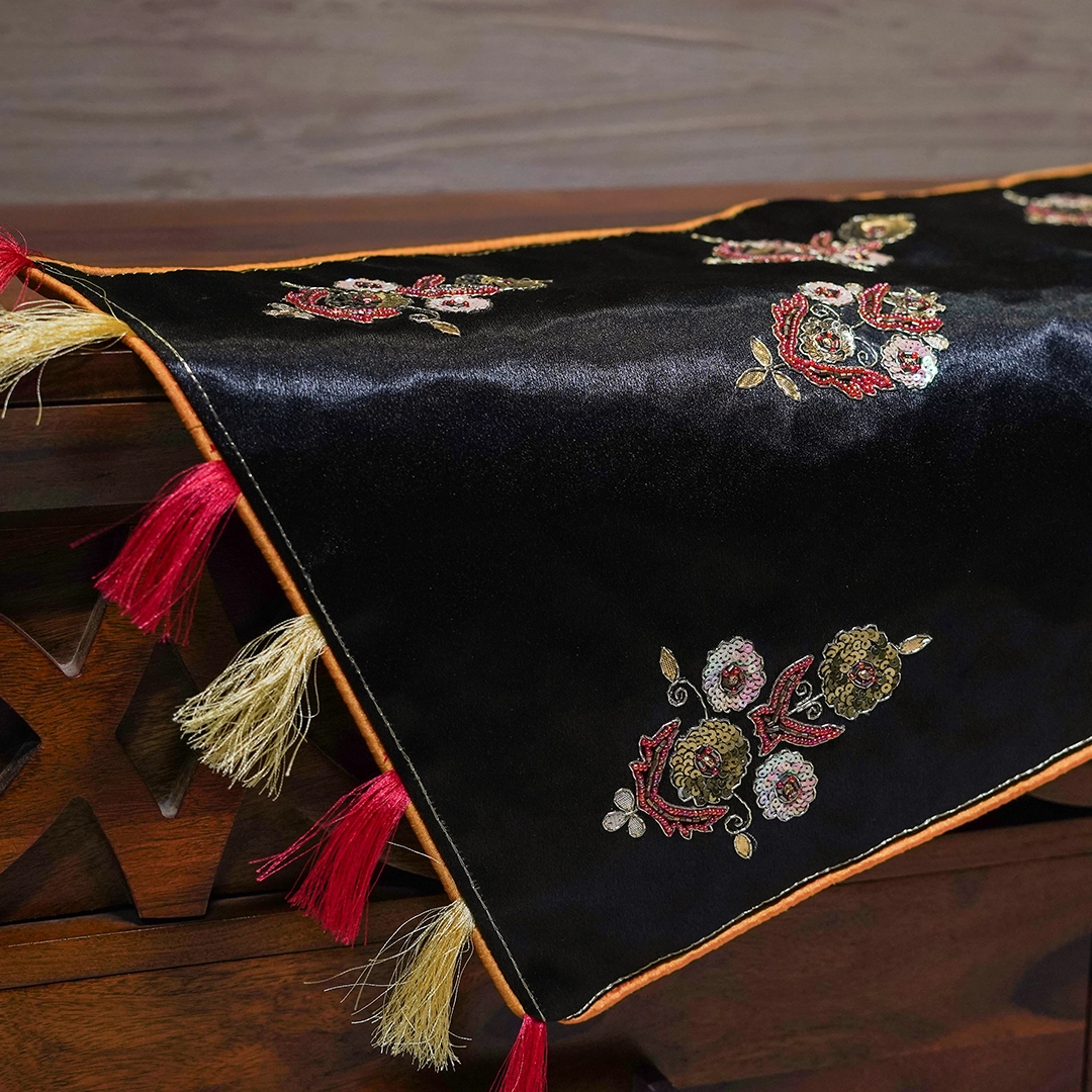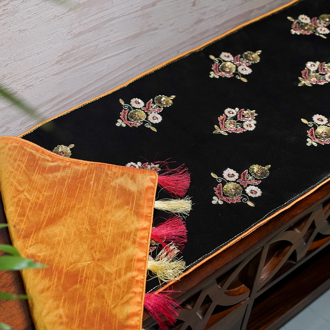 Embrace the opulent heritage of Awadh with our Awadhi Bloom Table Runner. This exquisite piece, handcrafted in Lucknow, features a rich black base adorned with intricate floral motifs. Each bloom is meticulously embroidered, showcasing the traditional artistry and delicate handiwork synonymous with the region's famed textiles. The vibrant threadwork and subtle sequin embellishments add a touch of regal elegance, while the playful tassels at each end provide a charming finish. Perfect for adding a sophisticated and culturally rich accent to your dining table or console.