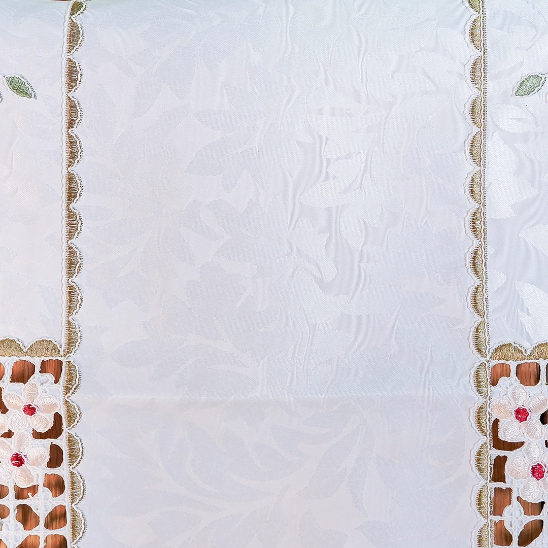 This is a stunningly crafted table runner that combines elegance and artistry. It features a luxurious white satin fabric with a delicate, tone-on-tone floral damask pattern. The centerpiece of the design is the exquisite cutwork embroidery, which creates a border of intricate floral and leaf motifs.